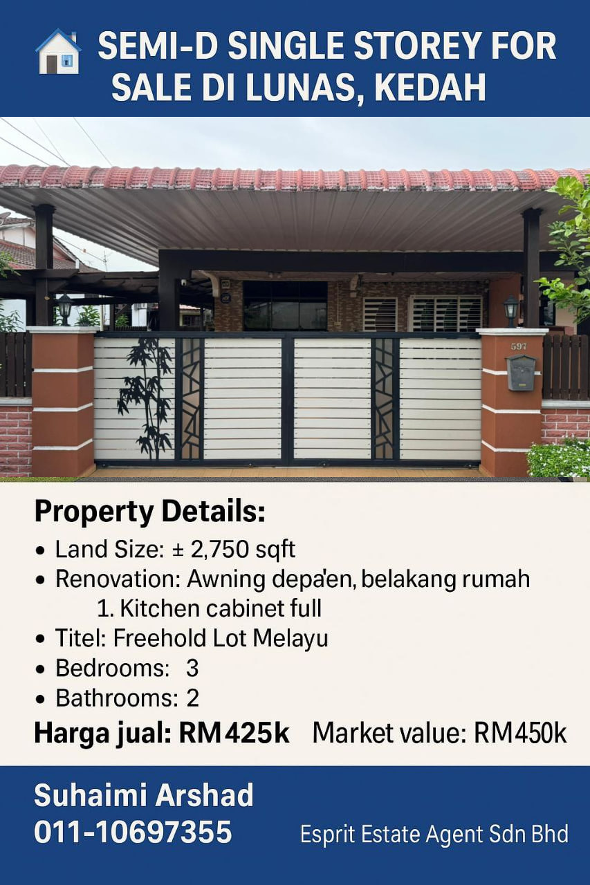 *🏡 SEMI-D SINGLE STOREY FOR SALE DI TMN SERI SENTOSA, LUNAS, KEDAH*